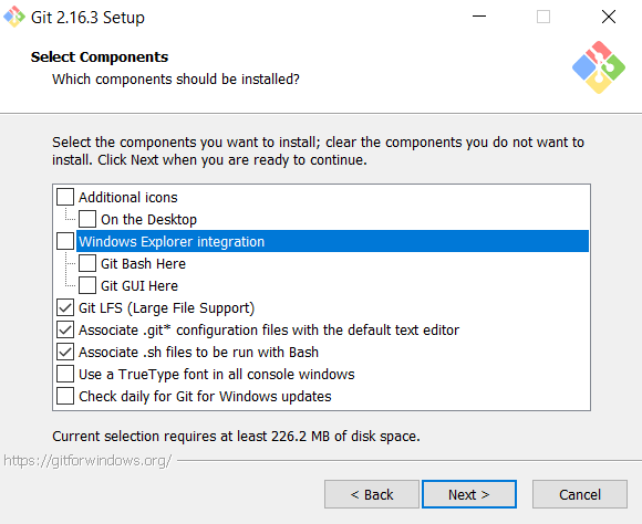 At a minimum, you should select Git LFS and associate .git* and .sh files. The other options are up to you and where/how you intend to use git.