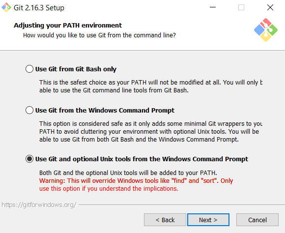 Change your path environment to “Use Git and optional UNIX tools from the Windows Command Prompt”. This will update your local path variables.