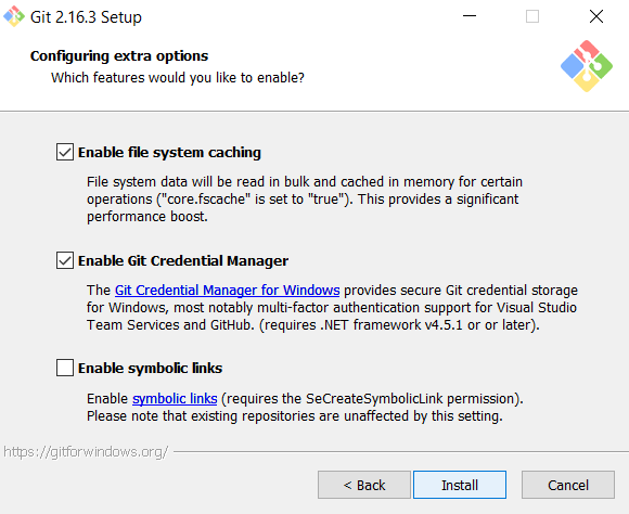 Extra options are up to you, but you probably want to select “Enable file system caching” and “Enable Git Credential Manager”: