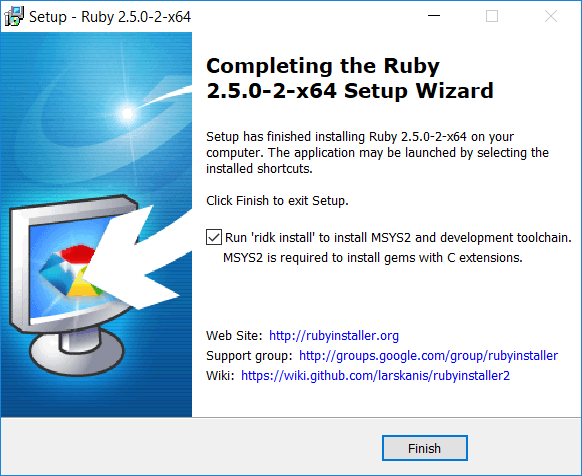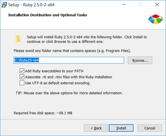 If you wish to install Ruby directly on Windows, the main trouble you’re likely to have is the install directory and updating the PATH. The instructions below should get you past both these issues.